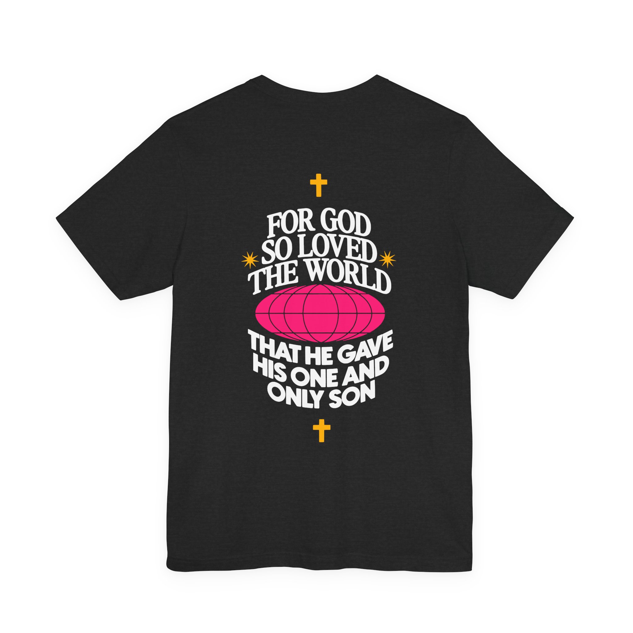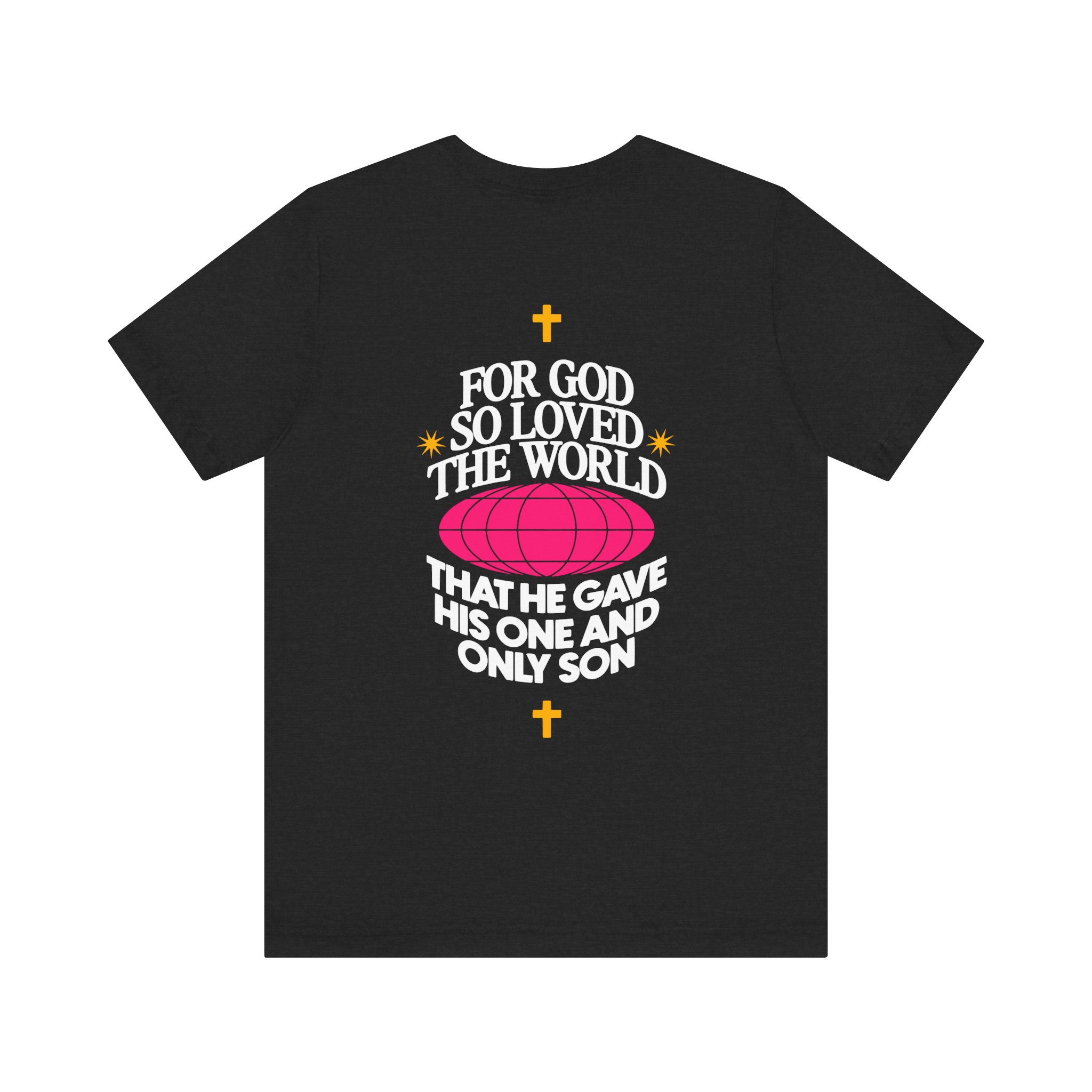 A classic unisex jersey T-Shirt featuring the Christian verse from the Bible ‘For God So Loved The World That He Gave His One And Only Son’. This T-Shirt exudes a spiritual and inspirational vibe, making it a perfect addition to the wardrobe of those who look for faith-based clothing. Ideal for believers, Christians, and those celebrating religious holidays and occasions.