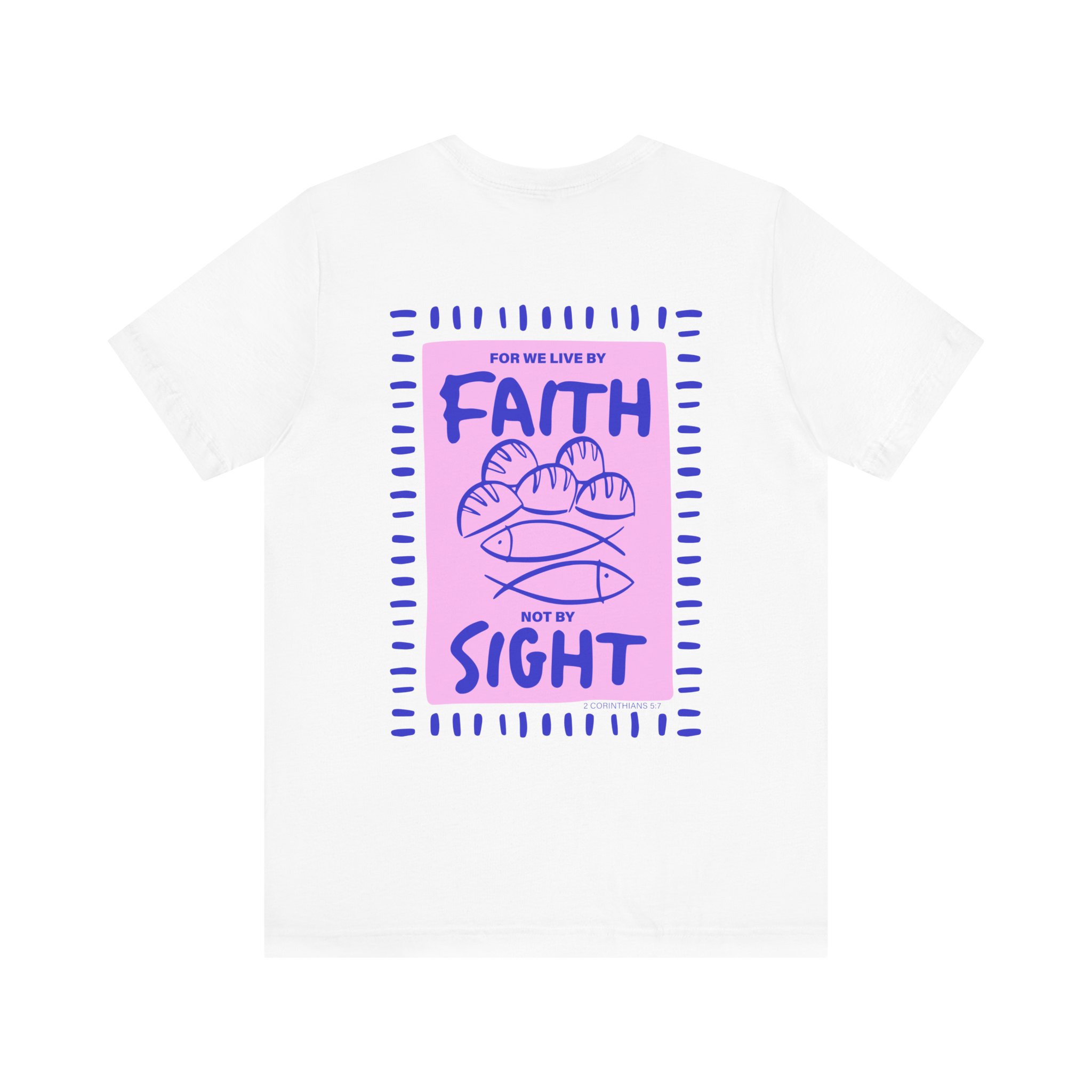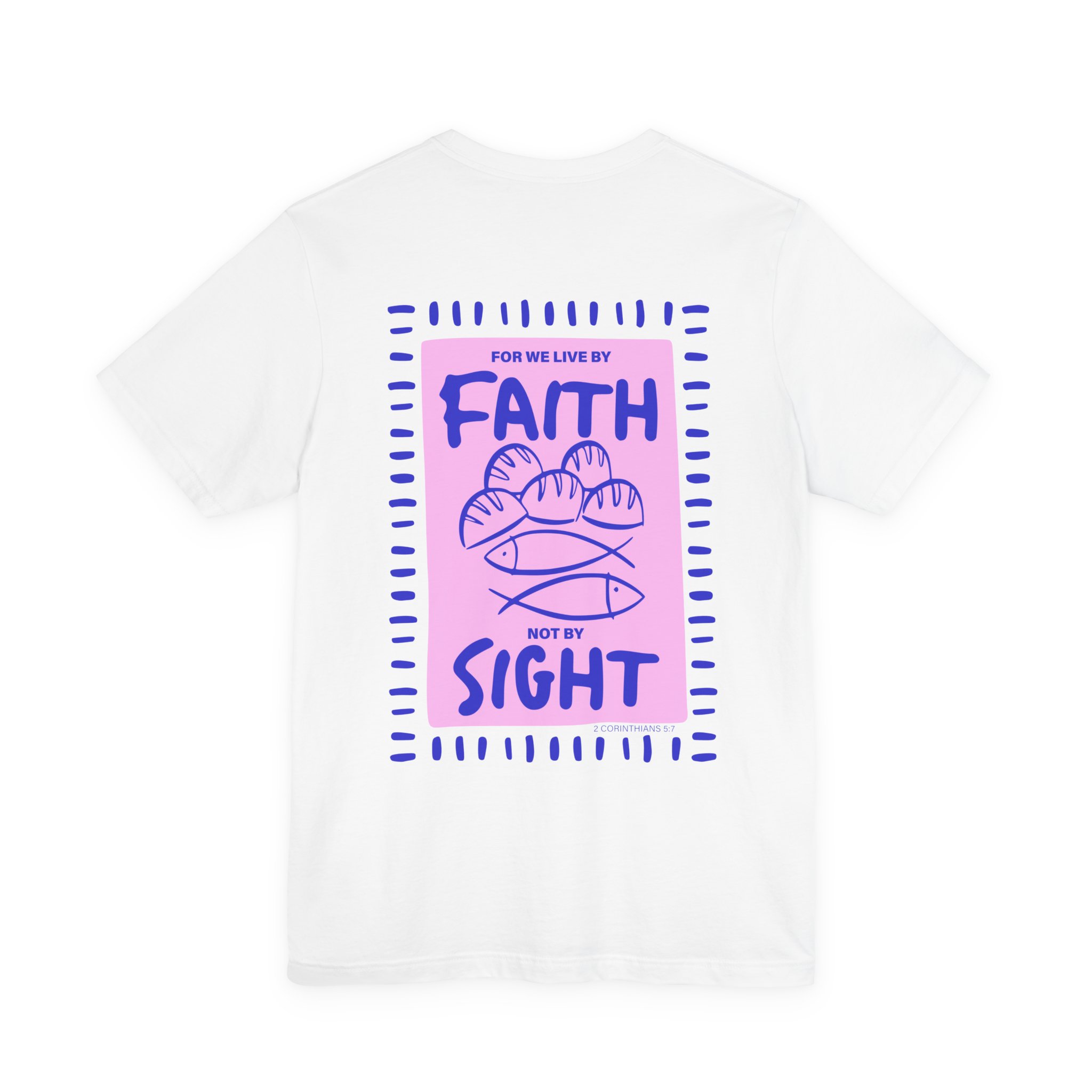 Christian T-shirt with the verse ‘For We Live By Faith Not By Sight’. This casual tee exudes a spiritual vibe, perfect for those who want to express their faith through fashion. Ideal for Christians and believers, this t-shirt is relevant for religious holidays and gatherings.
