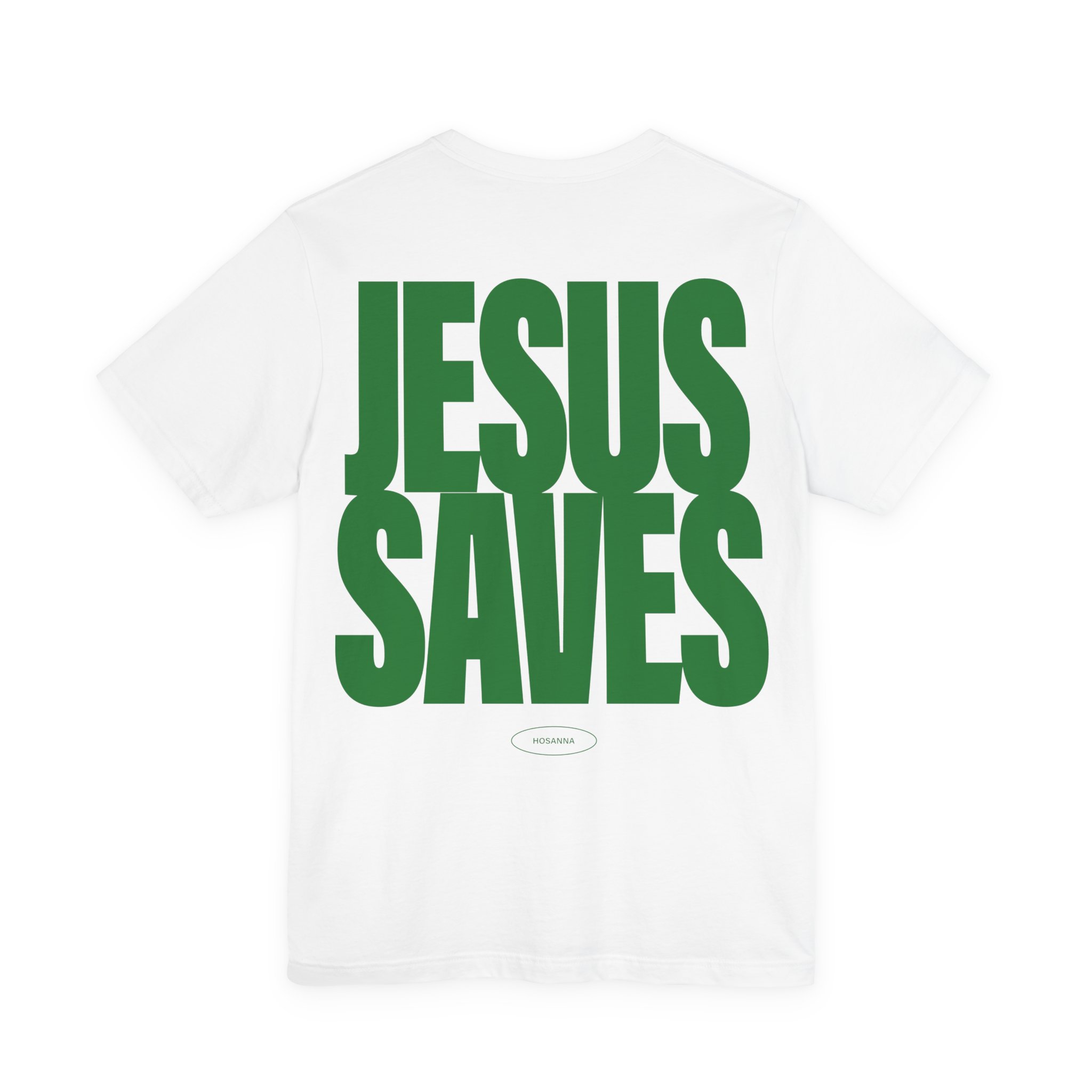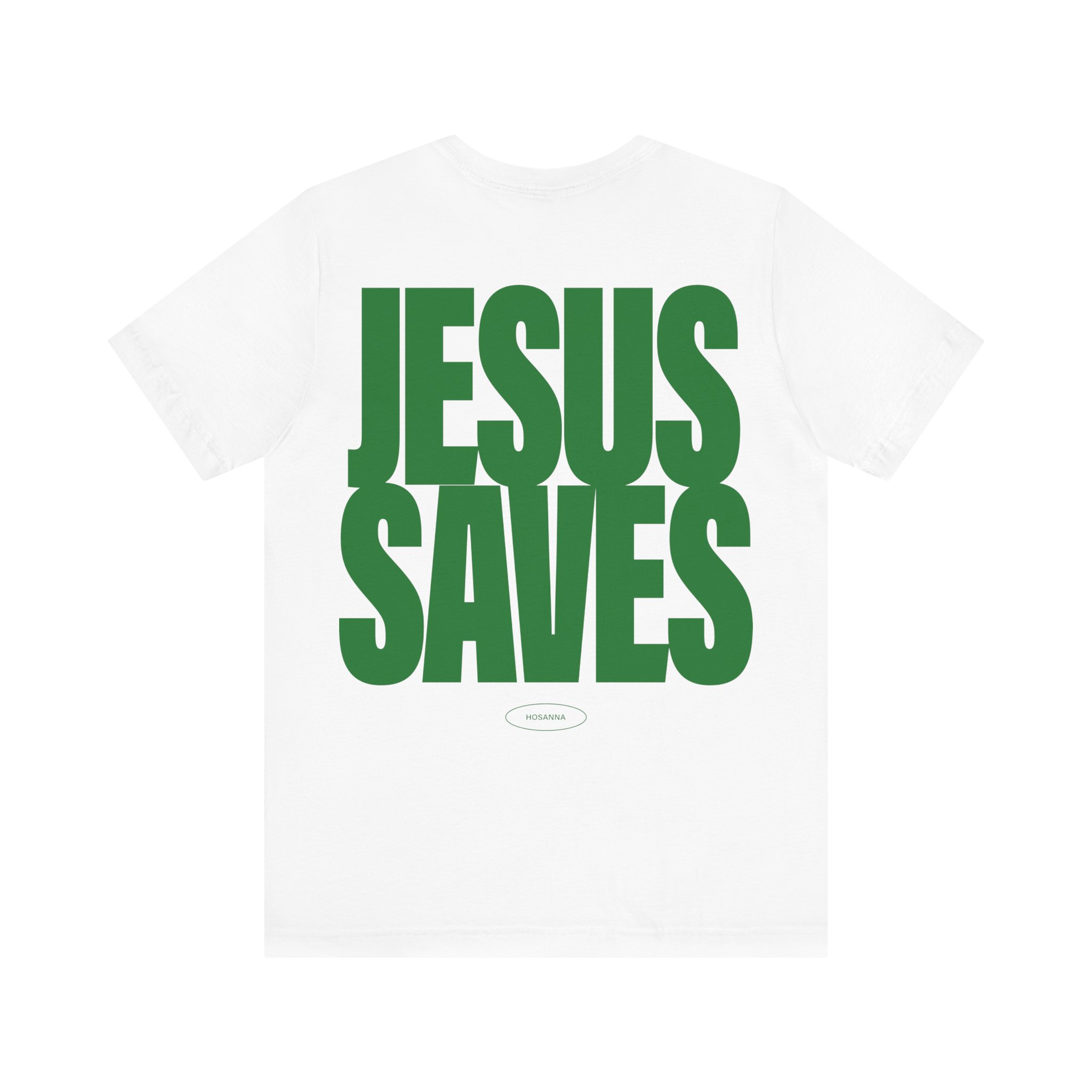 A bold and unmistakable message, “Jesus Saves,” set in a striking black font that demands attention. This tee is a proclamation of faith, perfect for those unashamed to share the message of salvation with the world.